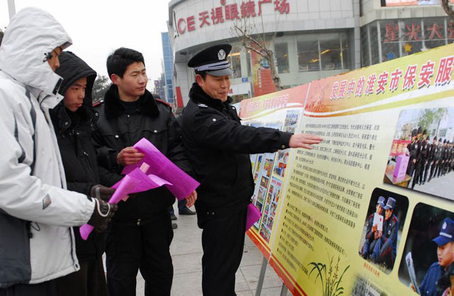 元月10日,是公安機(jī)關(guān)110宣傳日。當(dāng)日,總公司辦公室組織保安管理部、駐外保安部、押運(yùn)中心、培訓(xùn)部、技術(shù)防范部等部門,與公安機(jī)關(guān)一起在古順河體育館門前開展《保安服務(wù)管理?xiàng)l例》宣傳活動(dòng),通過拉橫幅、放展板、散資料等方式,廣泛宣傳保安條例,接受市民咨詢,深層次了解群眾對保安工作的需求和意見。