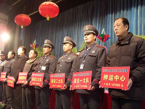 元月22日上午,總公司隆重召開“責任狀兌現(xiàn)暨春節(jié)安保工作會議”,會議對完成2005年任務指標的9個部門受狀人頒發(fā)了責任狀獎金,并對春節(jié)安全保衛(wèi)工作作了部署。武裝押運中心、保安大隊及各部門300余人參加了會議。