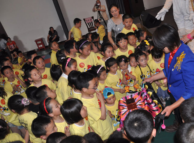 當(dāng)小朋友們還沒有從魔術(shù)的神奇中回過神來,小丑哥哥的滑稽表演立即又吸引了孩子們的視線。小丑哥哥到臺(tái)上和大家一起玩《憤怒的小鳥》游戲,小丑哥哥滑稽的表演讓小朋友們哄堂大笑。彈射出的不僅是玩具娃娃,更給小朋友們送去了快樂和幸福。第四個(gè)是小游戲,《雙雙對(duì)對(duì)對(duì)》,讓小朋友們到舞臺(tái)上和卡通人物一起互動(dòng),孩子們圍成一個(gè)圓圈尋找伙伴,使陌生的孩子們擁抱在一起,尋找到友情,同時(shí)理解了團(tuán)結(jié)就是力量。變臉大師把國(guó)粹變臉的絕活展現(xiàn)得淋漓盡致,整個(gè)表演一氣呵成。