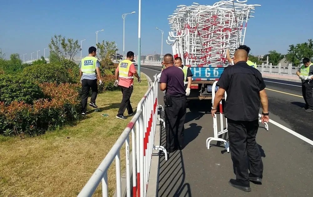 組織對沿途賽道實行全封閉,完成13000余米護欄、鐵馬等隔離設施的搬運、裝卸、擺放。